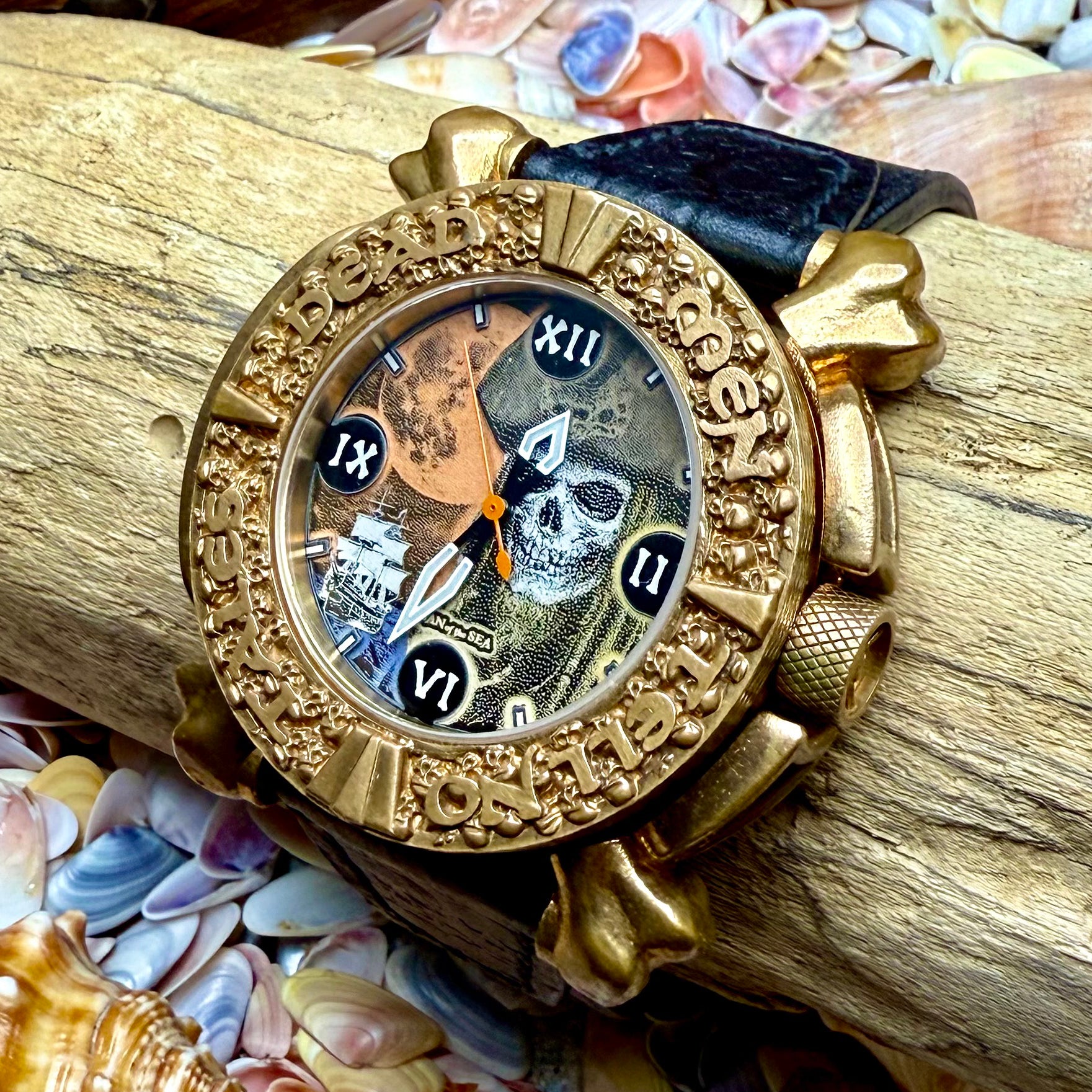 Be there a truer statement! This Ghost Ship Captain dial commands attention as small skulls pour out of the bezel as well as the side of the case cut-outs. I have a feeling that this combination will be one of the more popular. The watch is stunning in person as bits of light are reflected off the bezel where those words rise above the skulls to issue... not a warning, but a promise if you betray the code!